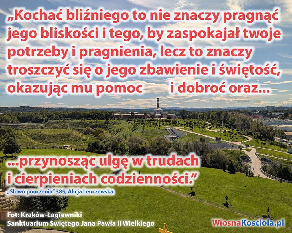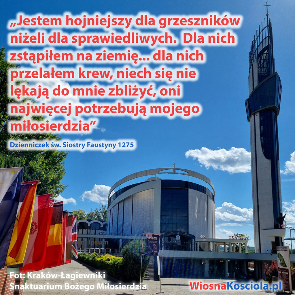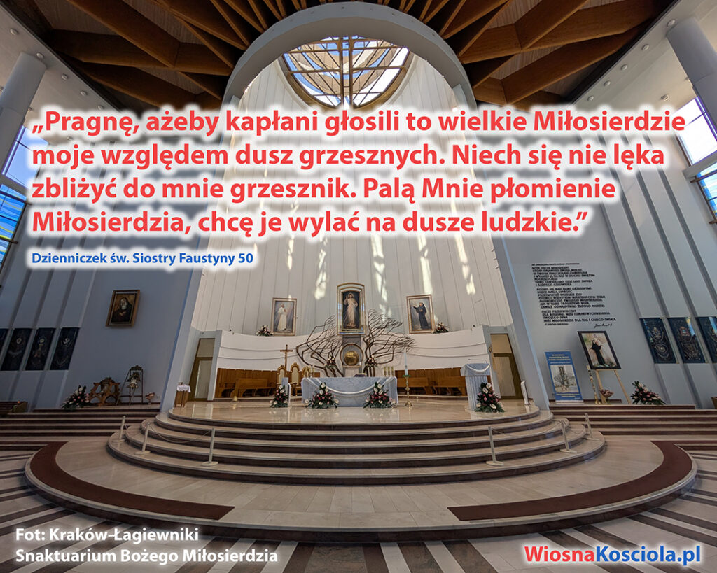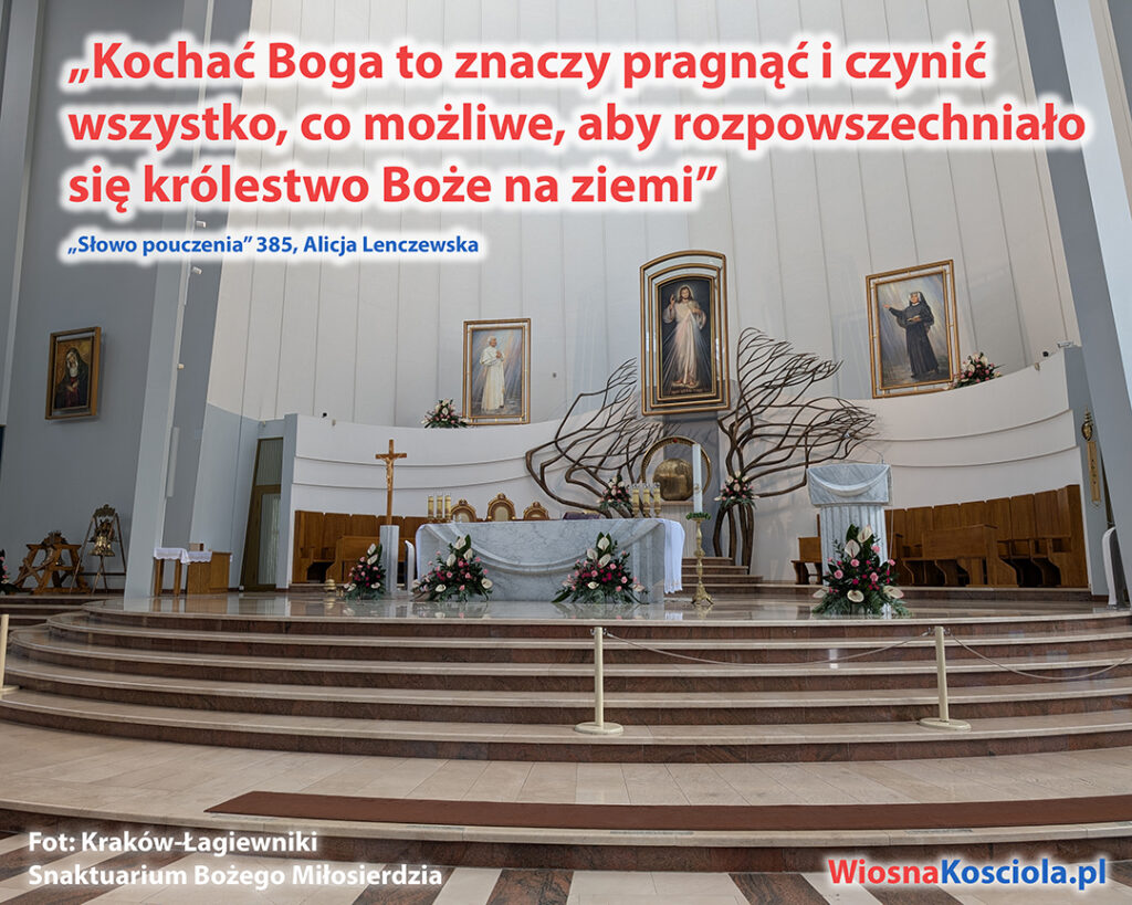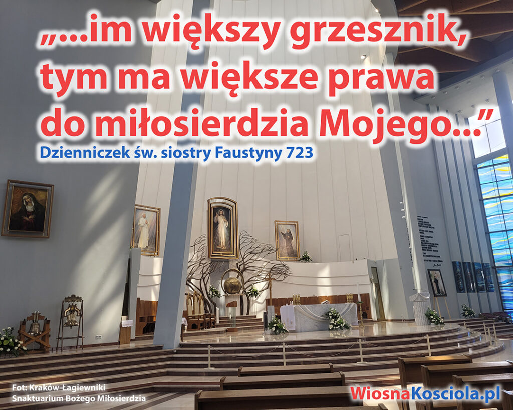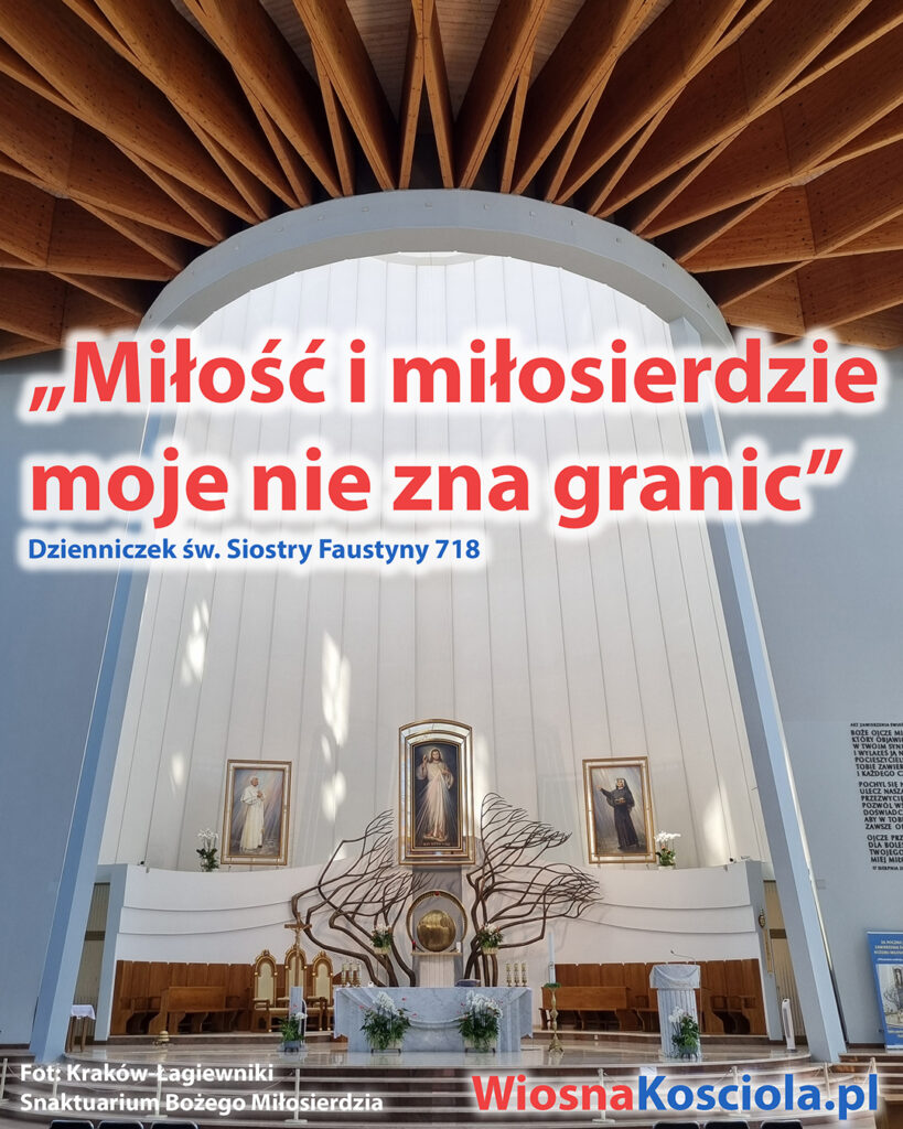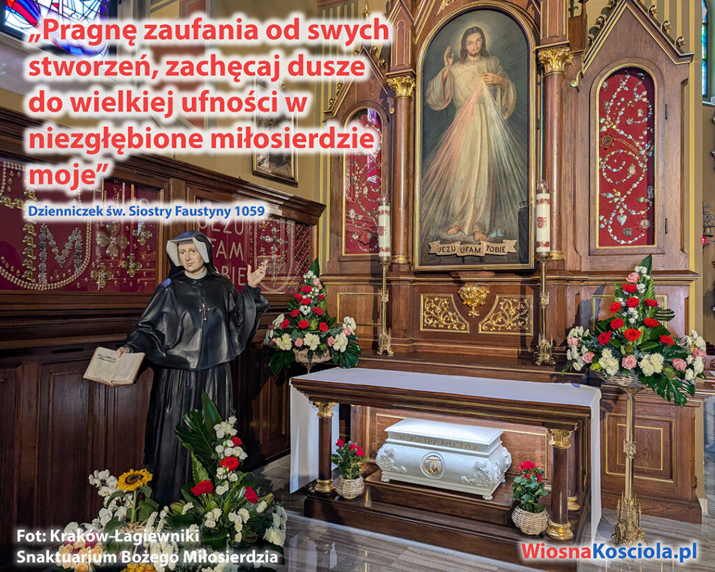 1048 Wtem nagle zostałam porwana w bliskość Jezusa i stanęłam na ołtarzu obok Pana Jezusa, a duch mój został napełniony tak wielkim szczęściem, którego ani pojąć, ani napisać nie jestem w stanie. Głębia pokoju i odpocznienia zalewała duszę moją. Jezus pochylił się ku mnie i rzekł łaskawie: Czego pragniesz, córko moja? — I odpowiedziałam: Pragnę chwały i czci dla miłosierdzia Twojego. — Cześć już odbieram przez założenie i obchodzenie święta tego; czego jeszcze pragniesz? I spojrzałam na te wielkie rzesze, które oddawały cześć miłosierdziu Bożemu, i rzekłam do Pana: Jezu, błogosław tym wszystkim, którzy są zgromadzeni dla oddania Ci czci, nieskończonemu miłosierdziu Twemu. Jezus zakreślił ręką znak krzyża św.; błogosławieństwo to odbiło się na duszach blaskiem światła. Duch mój zatonął w Jego miłości, czuję, jakobym się rozpłynęła w Bogu i znikła w Nim. Kiedy przyszłam do siebie, głęboki spokój zalewał duszę moją, i udzieliło się umysłowi mojemu dziwne zrozumienie wielu rzeczy, które przedtem były mi niezrozumiałe.